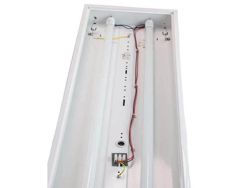 Lampa przystosowana do dwóch świetlówek LED T8 o długości 120cm, gniazdo G13, zasilanie jednostronne - najpowszechniejsze świetlówki. Oprawa rastrowa wykonana z blachy stalowej malowana proszkowo na biało, odbłyśnik rastrowy, pełna parabola odbijający i rozpraszający światło. Oprawa natynkowa do montażu na suficie lub ścianie.